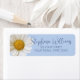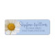 Uma etiqueta bonito de endereço de retorno com uma margarida branca e uma combinação de script e fonte simples sans serif no fundo azul claro.