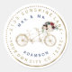 Design exclusivo de etiqueta de endereço circular com uma bicicleta dourada falsa com buquê floral de aguarela azul borgonha, escrita circular. Use a ferramenta Personalizar para adicionar suas informações, iniciais e talvez seja necessário ajustar para caber, alterar as cores da fonte. Adicione um espaço entre as letras e um espaço duplo entre as palavras para este "visual".