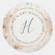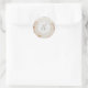 Rótulo de Endereço de Retorno Geométrico Floral Dourado, Adesivo Redondo Clássico." Elegante rótulo de endereço de retorno que pode servir também como selo de envelope, adicionando um toque final elegante à apresentação do seu convite. Tipografia manuscrita em conjunto com o nome, endereço e monograma do remetente sobre uma moldura geométrica circular simples e moderna com brilho dourado e estilo véu. O fundo é um romântico e delicado fundo floral de orquídea rosa. Desenhado graficamente pela artista e designer internacionalmente licenciada, Audrey Jeanne Roberts, copyright.