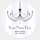 Um adesivo de etiqueta de endereço com um fundo de faixas verticais claras, azuis e brancas. Ilustração do candelabro cristal pendurado no centro. Personalize o texto preto na ilustração com seu nome e endereço. Procure itens de correspondência, como postagem e convites na Paperie de Jill.
