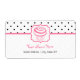 Um adesivo de etiqueta de endereço de aniversário com um fundo de pequenas bolinhas pretas sobre branco. Rosa. Quadro cor-de-rosa de dentro no centro superior. Personalize o texto cor-de-rosa e preto sobre a seção pura na parte inferior. Procure convites na Paperie de Jill.