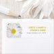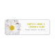 Uma etiqueta de casamento com um fundo branco. Imagem da margarida à esquerda. Personalize o texto amarelo e cinza à direita com suas informações. Procure por convites congruentes e mais na Categoria "Compro Casamento" da Escola Rosa.