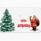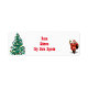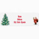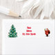 Um rótulo branco com cantos arredondados, com um design de Natal. No lado esquerdo, há uma árvore de Natal enfeitada com ornamentos coloridos e terra de jardim. Há uma ilustração do Pai Natal segurando um sino e um carregando de saco. O estilo geral é festivo e adequado para correspondência relacionada com férias.