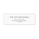 Essas etiquetas de endereço de retorno da família de cartões de feriado chic são perfeitas para um cartão de feriado ou convite moderno. O simples design apresenta uma tipografia clássica minimalista a preto e branco com um toque rústico. Personalizável em qualquer cor. Mantenha o design mínimo e elegante, como está, ou personalize-o adicionando seus próprios gráficos e trabalhos de arte.
