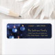 Design de etiqueta de endereço de devolução personalizável elegante e sofisticado com enfeites de natal azuis e letras douradas em um fundo azul escuro. Personalize com o seu próprio texto clicando no link "Personalizar Este Modelo".