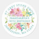 Adicione um toque especial aos envelopes do seu convite de aniversário com este elegante design redondo. Apresenta uma floral de aquarela de verão no centro. As folhas de eucalipto azuis dão-lhe uma vibração botânica rústica. O nome e o aniversário são escritos no centro em uma faixa branca, e o endereço é adicionado em texto curvado acima e abaixo do floral de cor d'água.