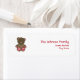 Um rótulo de endereço de Natal que ilustra um urso de pelúcia castanho com patas e orelhas listradas vermelhas e brancas. Personalize o texto vermelho com seu nome e endereço.