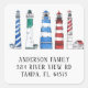 Design costeiro moderno com três faróis em faixas vermelhas, azuis e verdes.