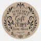 Uma bela etiqueta de chá de fraldas com a tipografia de tendências e o verso, "Cada presente bom e perfeito vem de cima." (John 1:17), em um fundo de estilo kraft.