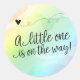 Este adesivo bonito apresenta um arco-íris de cores com aquarela e o texto "Um pequeno está a caminho". Use como um selo de etiqueta ou envelope.