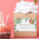 O pomar de Verão é uma fruta abundante, uma casa de campo rústica sente-se com galhos sobrepostos carregados de fruta. Este é um design de aquarela de verão divertido, com pêssegos, laranjas, cores escamosas complementadas por verde e flor delicada.