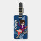 Etiqueta de mala para crianças bonitas, com um menino estrela do foguete com cabelo escuro segurando uma guitarra vermelha em um fundo azul. Ideal para o acampamento escolar, pois você pode adicionar o nome do seu filho e o número de telefone do contato no sentido inverso. Desenvolvido exclusivamente pela Sarah Trett para o meu pequeno eden.