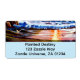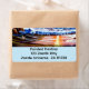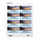 Pintura de uma praia ao amanhecer com pequenas ondas e gaivotas voando no colorido céu cor-de-rosa e laranja.