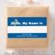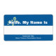 Etiquetas de nome personalizado com flor amarela em fundo azul. Banda branca para escrever nomes. Altere o texto inferior para mostrar o nome do seu grupo e evento.