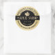 Personalize esta etiqueta de xarope de mapa com o nome comercial, o local, o grau e o volume (lista incluída de conversões nos EUA e métricas para tamanhos populares). Folha de mapeamento de ouro metálico central em círculo negro. Nome do estado no texto curvo próximo à parte inferior do rótulo. Fundo de gradiente de ouro pálido.
