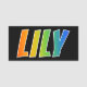 Este divertimento, características de design vibrantes, coloridos do nome de etiqueta o nome comum "LÍRIO", com as letras do nome que tem um espectro colorido do arco-íris gosta do teste padrão da coloração do inclinação, em um fundo colorido preto. Um nametag como este pôde ser vestido por um membro do pessoal, por um voluntário, ou por um empregado nomeado Lírio, para ajudar a identificar o portador a outro. [~Z0000344]