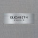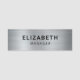 Etiqueta de nome moderna com um nome e título em tipografia simples contra um fundo metálico falso prateado.