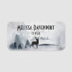 Um nome de etiqueta com uma imagem de aquarela apresentando uma rena preta de silhueta que fica entre alguns pinheiros. Esquema de cor neutra a preto e branco.