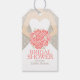 Noiva de pele clara e elegante em um vestido branco de casamento com véu segurando um poste de rosa laranja estilizada etiqueta de chá Bride. Lê Chá de panela honrando a personalização com o nome das suas noivas. Excelente para chás de panela, noites de galinha ou ensaios de casamento.
