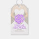 Noiva de pele clara e elegante em um vestido branco de casamento com véu segurando um poste de rosas roxos estilizados com a etiqueta de chá Bride. Lê Chá de panela honrando a personalização com o nome das suas noivas. Excelente para chás de panela, noites de galinha ou ensaios de casamento.