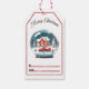 Esta charmosa etiqueta de férias mostra um delicioso globo de neve com um caminhão vermelho estacionado em frente a uma casa acolhedora, cercado por árvores cobertas de neve, perfeito para a festiva doação.
