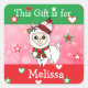 Bela etiqueta de presente de Natal. Uma pequena mão desenhou um desenho animado lama com chapéu de inverno sobre com fundo verde e vermelho com estrelas e ouvidos e o texto, "Este presente é para." Basta adicionar o nome do destinatário na área de personalização.