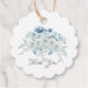 Etiqueta de presente de chá de fraldas da festa de chá na moda com uma xícara de chá cheia de um buquê de flores azuis. Visite nosso compro para ver nossa coleção de chás de chá!
