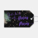 Uma etiqueta de presente Feliz Halloween Hocus Pocus perfeita, projetada com letras roxas vibrantes e estrelas esfumaçadas em um fundo preto.
