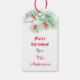 Uma etiqueta de presente de Feliz Natal personalizada, à moda antiga, com gótica personalizada e letras de script em vermelho e verde e uma ramificação de pínus gravando com pinos vermelhos na frente e um padrão de pínus de férias verdes no verso.