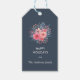 Etiqueta de presente floral de inverno com belo buquê de flores de pincel e pêssego com folhagem azul de inverno sobre fundo azul marinho. O script personalizado está na fonte minimalista sans serif