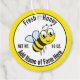 Uma abelha alegre está no centro desta etiqueta de mel. Você pode editar o texto para criar sua mensagem personalizada. O texto da tela diz 'Fresco de Mel NET WT. 16 OZ. Adicione o nome da Fazenda aqui. A etiqueta é redonda. A abelha é dentro de um círculo branco que tem uma borda preta e amarela. O texto é preto.