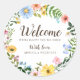 Bela etiqueta de boas-vindas para casamento com flores silvestres apresenta lindas flores de prado em aquarela, feitas em uma paleta de cores pastéis. Este design floral é perfeito para criar papelaria de casamento com tema de jardim ou rústico! Torne-o seu com facilidade, inserindo suas informações. Um modelo de etiqueta floral elegante e delicado para tornar a ocasião ainda mais especial.