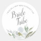 Etiqueta de vela de proposta de madrinha ou dama de honra botânica em aquarela elegante em formato circular único emoldura os detalhes da sua proposta com uma borda de folhas e flores em aquarela cinza em tons pálidos e frios de cinza e verde. A fonte é definida em um tipo elegante tradicional sem serifa e manuscrita. Perfeito para adicionar a velas como presente para pedir às damas de honra. Para ver mais designs como este, visite VG Invites em www.zazzle.com/vginvites