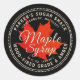 Edite para adicionar seu nome comercial, endereço, volume de xarope de mapeamento e nível com descrição opcional. Rótulo preto com borda dupla e folha vermelha de açúcar no outono.