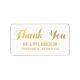 Dourado Casamento De Elegância Obrigado Devolva A Etiqueta De Endereço. Design por Elke Clarke© Disponível em www.zazzle.com/monogragallery. Mande seu casamento cartas de agradecimento para seus amigos e família usando esta bela e simples etiqueta com as palavras "Obrigado" escritas em uma caligrafia dourada. Você pode personalizar com sua noiva e nomes de noivos. Efeito fotográfico impresso de folha de ouro. Outras cores disponíveis.