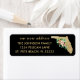 Nossa etiqueta de endereço de retorno glamourosa mostra o mapa da Flórida em folha de ouro metálica texturizada com um spray de flores tropicais aninhadas na Grande Benda na costa oeste. O texto no rótulo inclui o anúncio móvel "nosso novo endereço" e seu nome e novo endereço em tinta dourada para corresponder ao ouro texturizado do mapa. Todo texto de exemplo é facilmente substituído por suas próprias informações.
