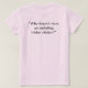 A frente desta camisa apresenta uma imagem de fã antiga e "Etiqueta e Espionagem Gail Carriger" sobre a área de bolso, e a parte de trás lê "Quem não quer uma galinha mais vadia explosiva?" Porque, onde, quem não quer?