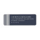 This return address label features a minimalist and elegant design with a deep navy blue background that contrasts beautifully with the crisp white text. The layout is vertically oriented, showcasing clean lines and ample negative space for a modern aesthetic. A series of thin vertical stripes on the left adds a subtle border effect, enhancing the sophisticated look. The typography uses a classic serif font, ensuring legibility and balance, while the overall style conveys formality and refinement, making it perfect for official communications or special announcements.