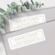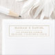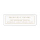 Elegante e simples carimbo de endereço de devolução de casamento, em um design minimalista moderno, apresentando o nome da noiva e do noivo em tipografia serifada estilosa com uma borda elegante, combinado com um texto de endereço de envio personalizável em uma fonte da moda para um sentimento sofisticado e chique em dourado e branco clássicos.