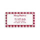 Caligrafia de tendências "Feliz Natal" etiqueta de endereço de retorno Este design apresenta feriado de xadrez vermelho e branco e texto personalizado.