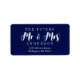 Uma simples e elegante etiqueta azul de retorno do endereço para o futuro Sr. e Sra. em tipografia de script escrita à mão. Etiquetas de endereço de retorno elegantes para casamentos, chás de panela, festas de noivado ou quaisquer outros envios antes do dia do seu casamento.