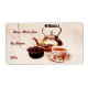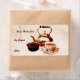 Em casa, uma deliciosa etiqueta de enlatamento de geleia com um chá+pote de cobre, uma xícara de chá e um prato de vidro com geleia