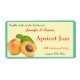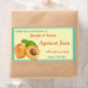 Dois damascos maduros, um fatiado ao meio com o poço ainda dentro e algumas folhas são enfiadas no canto inferior esquerdo deste rótulo com um fundo de amarelo pálido, rodeado por uma borda e fundo de verde-turquesa moderado que fazem deste um rótulo perfeito para usar nos seus potes de doce ou de conservas de damasco caseiro. O texto está na forma de modelo para que você possa mudá-lo para o que quiser.