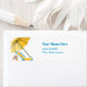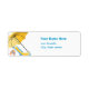 Uma ilustração gráfica de uma cadeira de salão de praia e chinelos em uma etiqueta de endereço de retorno de uma festa de piscina/praia. O rótulo tem modelos de texto para sua personalização. ©2013charmanepaulson