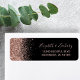 A borda esquerda desta elegante e moderna etiqueta de endereço de volta do casamento apresenta um rosa dourado faux glitter design. O texto personalizável combina letra rosa pálida, letra copperplate e letra itálico num fundo preto.