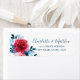 Etiquetas de endereço de retorno de casamento elegantes design com rosa vermelha pintada e folhagem azul em fundo branco.