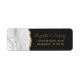 A borda esquerda desta elegante e moderna etiqueta de endereço de retorno de convite de casamento apresenta uma cinza e uma borda branca com uma falso brilho dourado. O texto personalizável combina letras douradas e fontes de impressão impressas em um plano de fundo off-black.