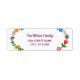 Rótulo de endereço de retorno personalizado de na moda para uma família (pode ser personalizado para uma pessoa também), com um motivo floral ao redor das bordas esquerda e direita, e com um roteiro informal manuscrito elegante e contemporâneo para o nome da família ou o nome da pessoa.