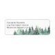 Rótulo de endereço de retorno com cena de floresta de cor d'água de pinheiros verdes. O modelo está configurado para você adicionar seu nome e endereço em tipografia elegante em maiúsculas.