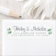 Chic, simples e moderno rótulo de endereço de retorno de casamento mostra seus nomes em letras elegantes e elegantes letras maiúsculas e tipografia em um fundo branco com um toque na moda de folhagem verde de eucalipto. Basta adicionar seus nomes e endereços ao adesivo rsvp. Desenvolvido exclusivamente para você pelo Happy Dolphin Studio. Se precisar de ajuda ou produtos correspondentes, entre em contato conosco em happydolphinstudio@outlook.com. Estamos felizes em ajudá-lo a fazer seu casamento o dia mais bonito!